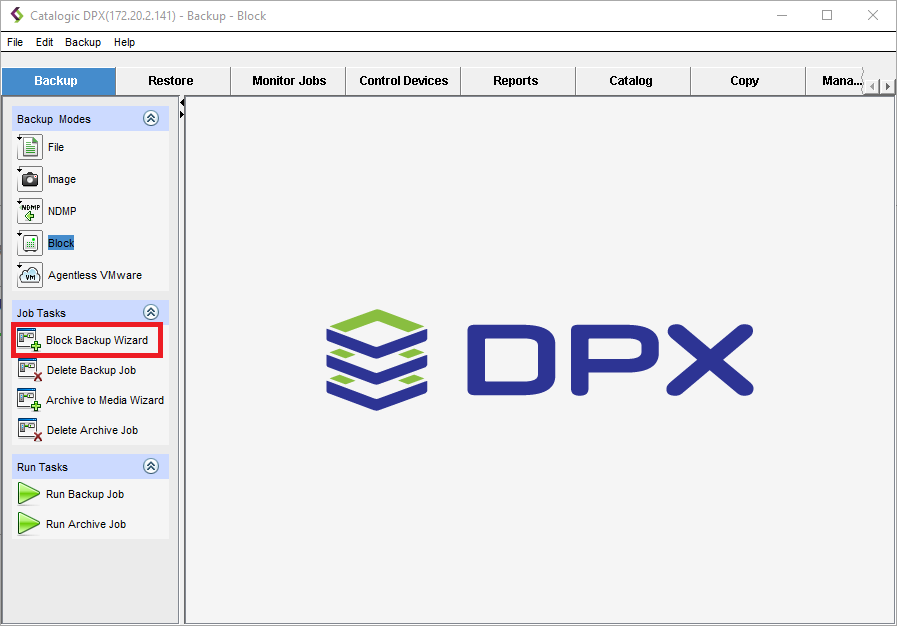In the Job Tasks section of the task panel, find and click Block Backup Wizard.