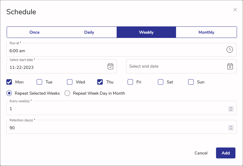 In the job creation/editing view, scroll down to the SCHEDULES pane and click Add Schedule. The Schedule dialog will open. Depending on the selected frequency, the dialog will display slightly different parameters to select. Below, the Weekly schedule view is shown.