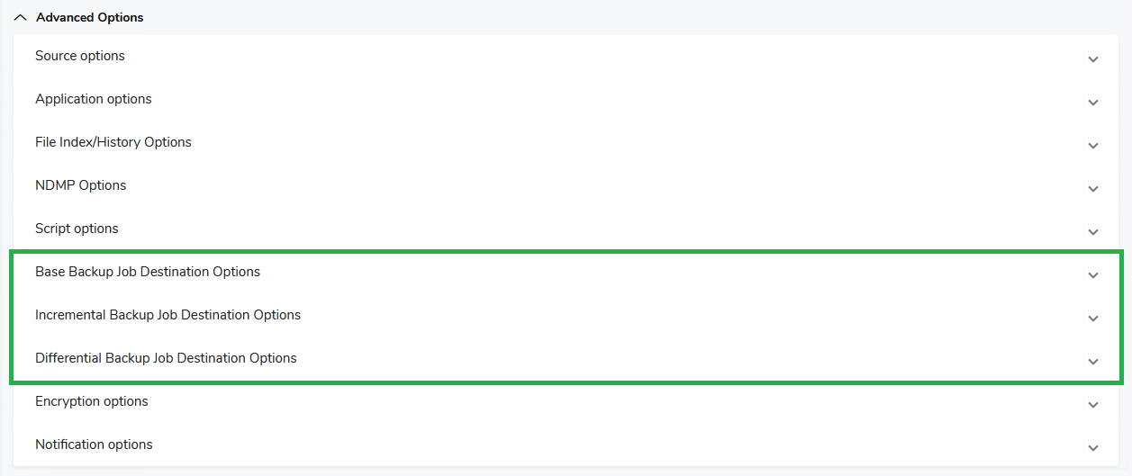 Note. The Advanced Options section in the web interface also includes job source options which are discussed in a separate section for the sake of clarity. See Job Source Options for File Backup.