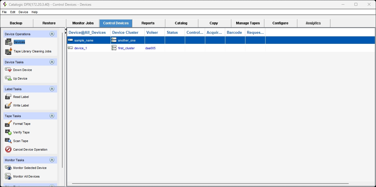 Use the Control Devices operation to manage storage devices, tape libraries, and media volumes. In the Control Devices tab, you can open the following pages from the task panel: