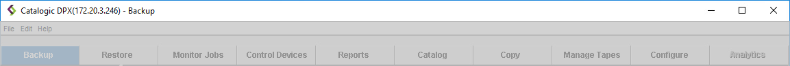 These tabs are Backup, Restore, Monitor Jobs, Control Devices, Reports, Catalog, Copy, Manage Tapes, Configure, and Analytics. The Analytics tab is now deprecated and therefore it has been disabled.