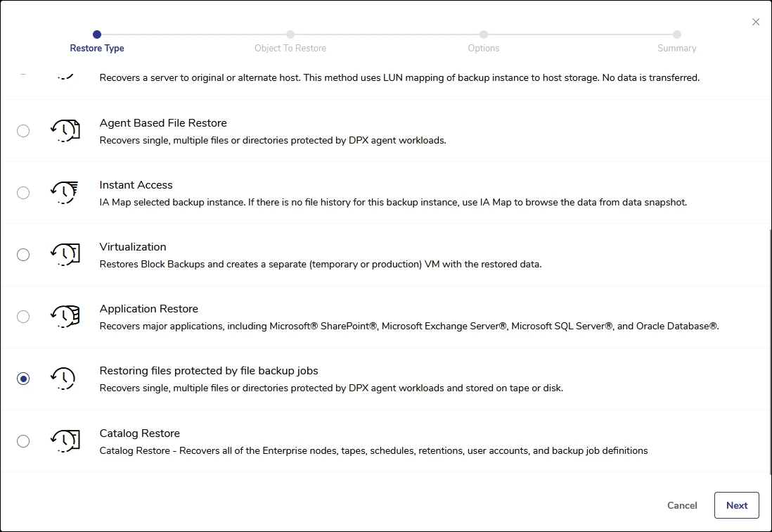 DPX allows you to restore files or directories protected by DPX agent workloads stored on tape or disk.