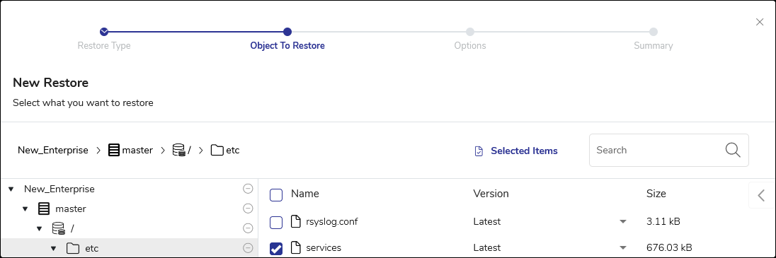 A list will appear showing all files and directories backed up by previous file backup jobs. Select the files or directories you wish to restore and click Next.