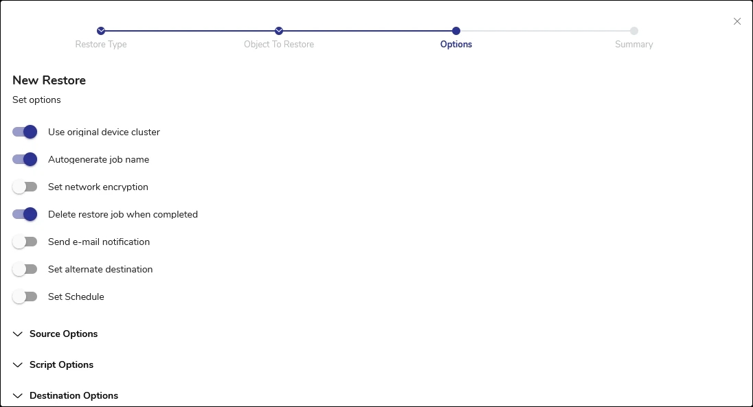 Specify job options. This job can be tailored to meet specific recovery needs through a variety of settings and parameters.