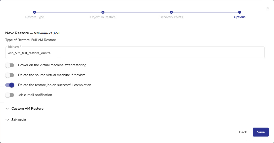 Important. When specifying a schedule, make sure the Delete the restore job on successful completion toggle is switched off. Otherwise, the job will be deleted upon its first successful completion.