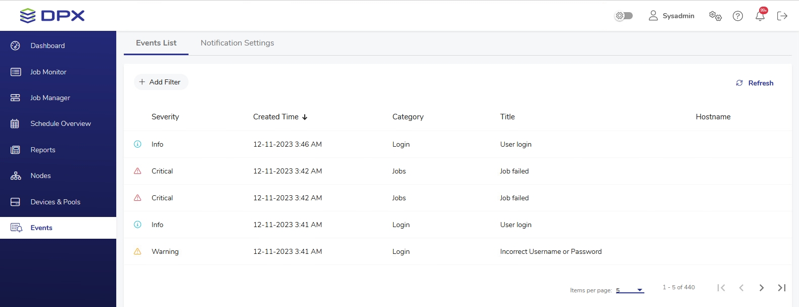 You can control this view by ordering items by Severity, Created Time, Category and Title. Just click the column header to enable ascending/descending ordering. The Hostname column will usually be empty, as most events concern the DPX Master Server itself. If a warning is triggered e.g. by GuardMode Agent, its IP address or resolvable name will appear in the Hostname column.
