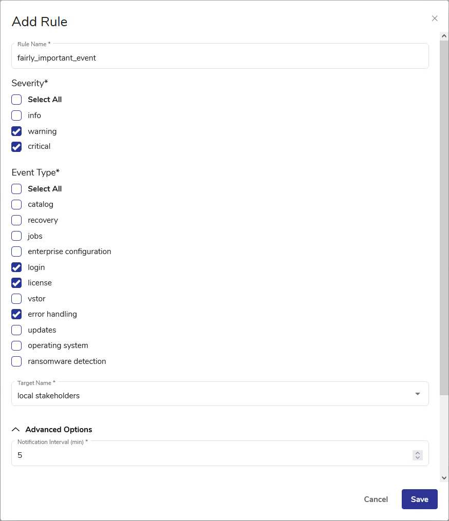 Select the Severity of events that will be reported in the notification. Unchecked severity levels will be ignored by this rule. Multiple selection is possible.