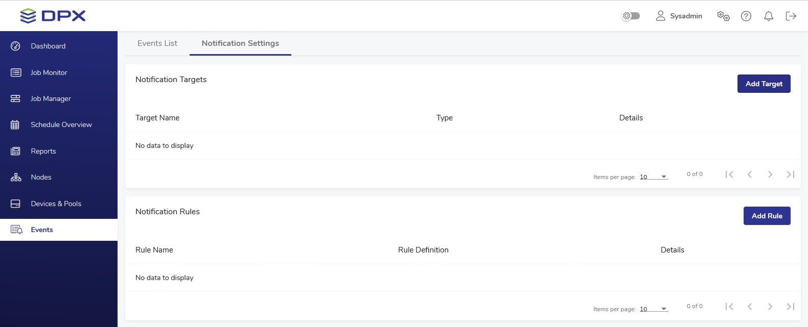 The Notification Settings tab consists of two main areas: Notification Targets, where notification recipients are defined and stored, and Notification Rules, which stores definitions of situations when a certain notification target is sent a message.