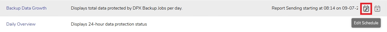In the Edit Schedule dialog, hover over the report schedule definition. Select the Edit icon to change the schedule item, or the Delete icon to discard the schedule item and define a new one.