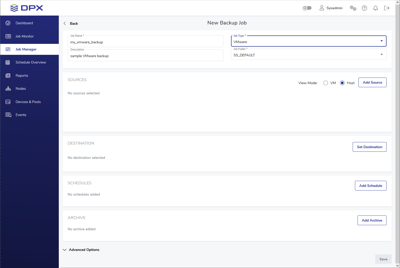 Specify the Job Name. For VMware Backup, this field may contain no more than 16 characters. You can also add an optional description (up to 48 characters).