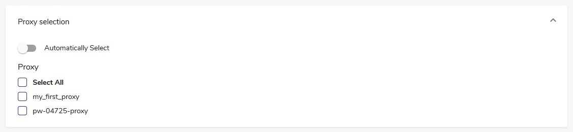 The Proxy Selection section consists of the Automatically Select toggle. By default, the toggle is on. DPX chooses the proxy servers to use for the backup job and how many to use for load balancing. When the toggle is off, the list of all proxy servers is displayed and you can choose which proxy servers will be used for the backup job. Multiple selection is possible.