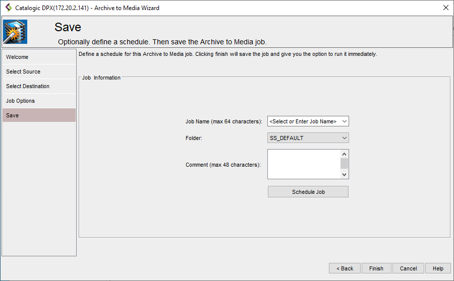 In the Save step, you must enter the Job Name (max. 16 characters) and specify the Job Folder to store the job in (the default folder is SS_DEFAULT). You may also add a comment to the job definition or set up a schedule (See Scheduling a Block Backup).