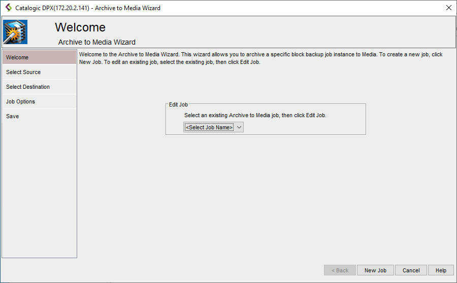 By default, the creator allows you to select from the drop-down list and edit an already existing job. To create a new block backup job, click the New Job button in the lower right corner.