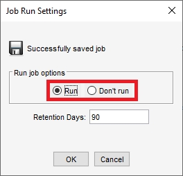 Click Save. The Run Job prompt pane will be shown, where you may determine the retention period (default: 90 days) and choose whether to run the job immediately. Either way, the job will be available in the Job Manager section.