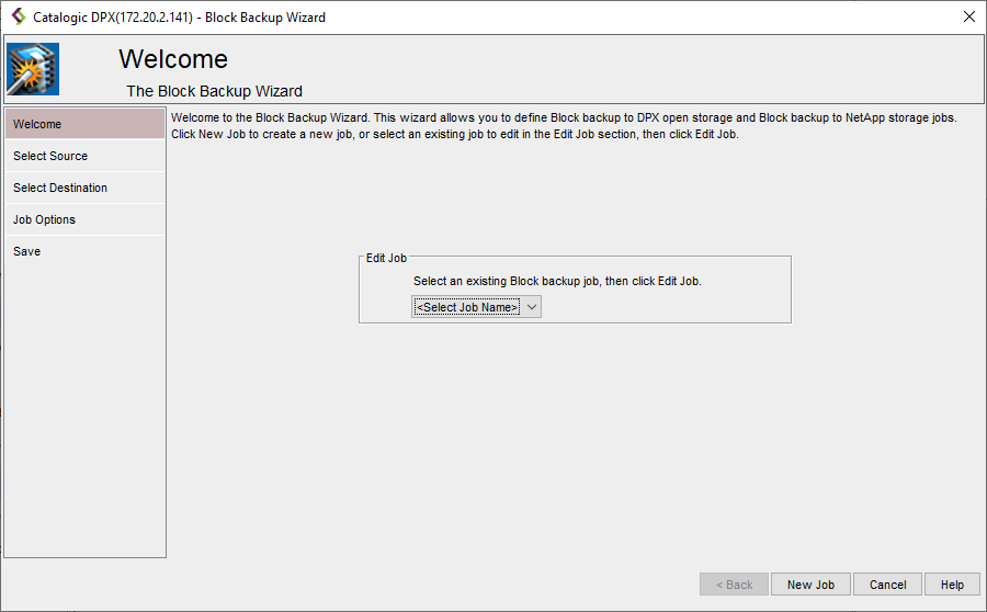 By default, the creator allows you to select from the drop-down list and edit an already existing job. If you want to create a new block backup job, click the New Job button in the lower right corner.