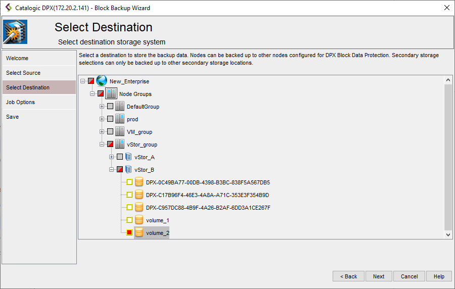In the Select Destination screen, choose the destination for the backup job. Click Next.