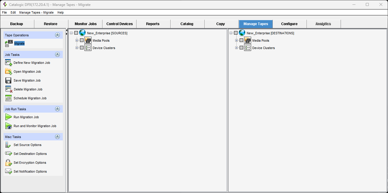 Use the Manage Tapes operations to create tape migrate definitions, and to schedule and launch jobs to migrate media volumes.