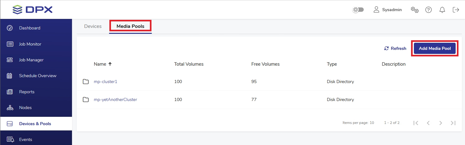 Go to Devices & Pools in the sidebar. Switch to the Media Pools tab, then select the Add Media Pool button in the upper right corner. If you have added a device cluster through the web interface and kept the Automatically create corresponding media pool Toggle on, some media pools (with the
