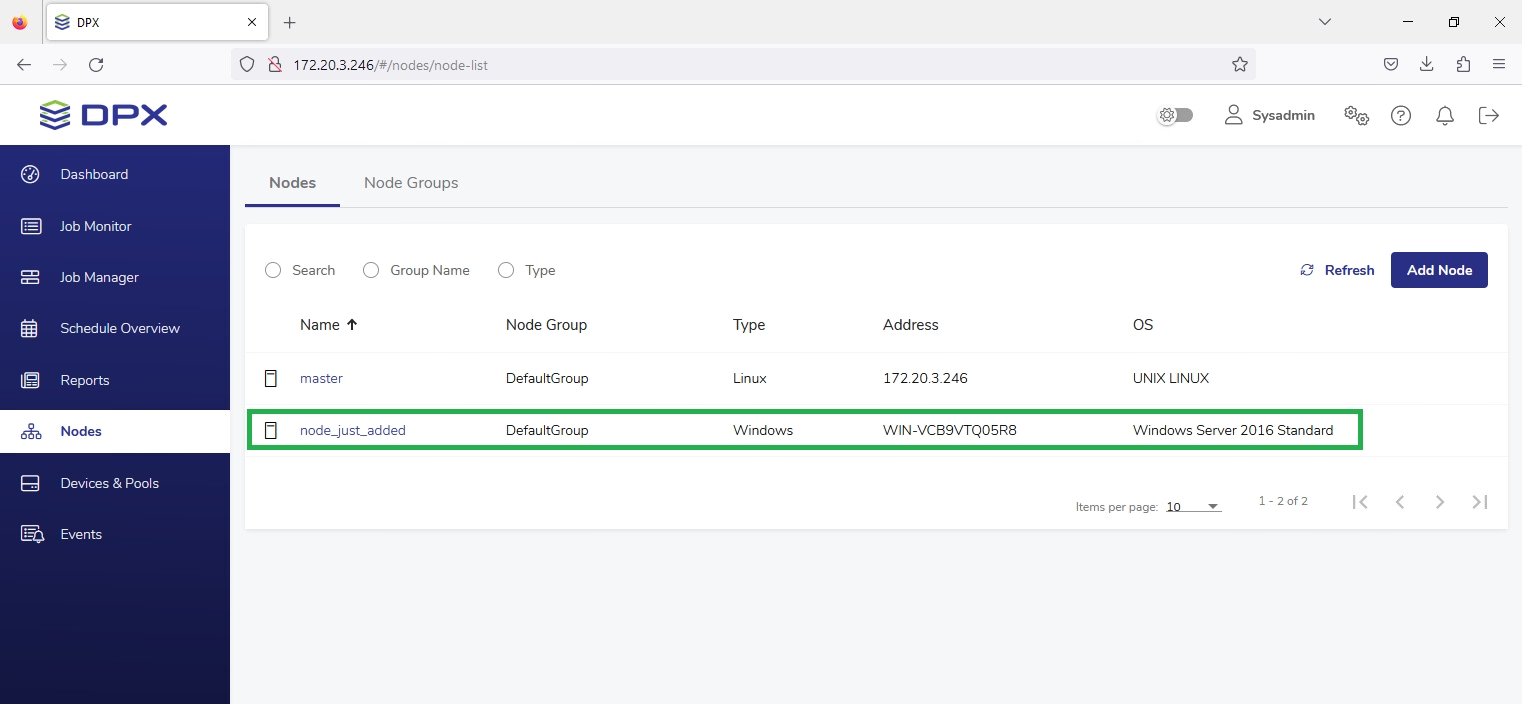 Go to the Nodes section in the sidebar. A list of all nodes added to the DPX Master Server will be shown. At least one node, master, should be already on the list. This is the Master Server itself – compare the IP address in the list and in the web browser’s address bar. The Master Server can also serve as a client to back up data from itself.