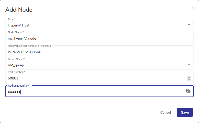 Select Hyper-V Host as type. Specify the name for the new node (it must be unique throughout the Enterprise), provide a valid resolvable hostname or IP address, and select the group for the node.