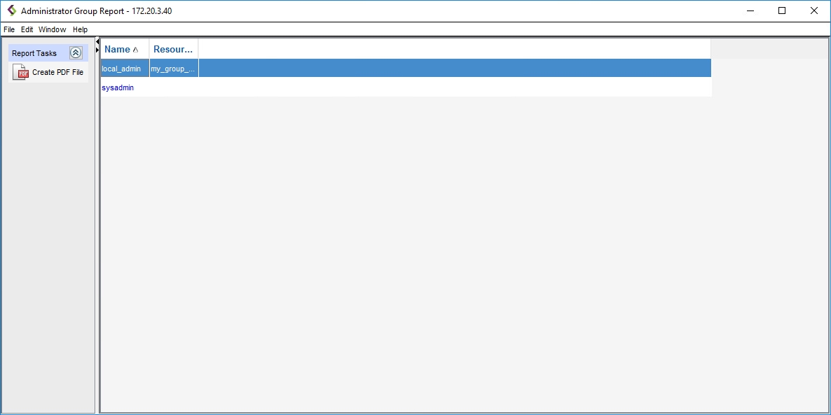 The Administrator Group Report window appears. The fields in this report are Name and Resources.\