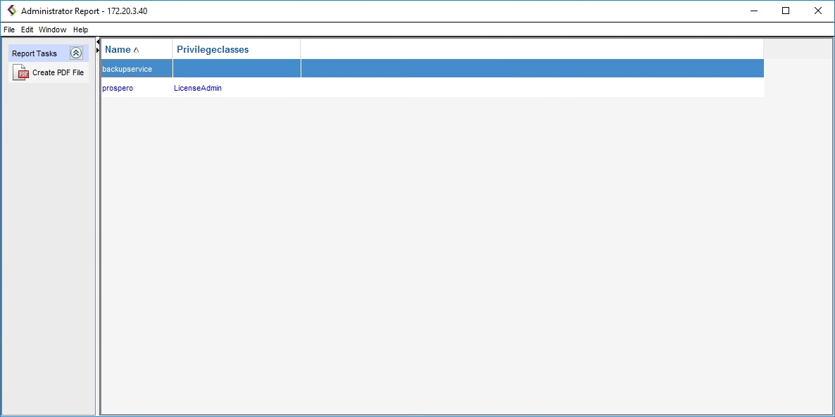 In the left pane of the Configure Administrators window, right-click on any administrator name or icon to display a context menu. Then select Report.