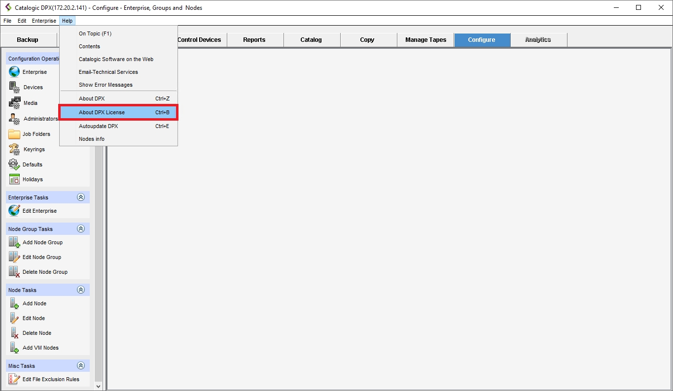 The out-of-box version of DPX Master Server comes with the evaluation license which is valid for 30 days. To keep using DPX beyond that date, you need to update the license. Moreover, you have to renew the license when the current one is expiring or after you purchase a new license for additional features, such as block storage capacity, the number of CPU sockets, etc. Contact your account manager for detailed information about the Catalogic DPX license plans.