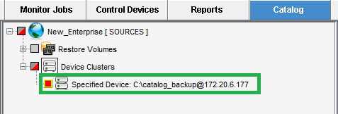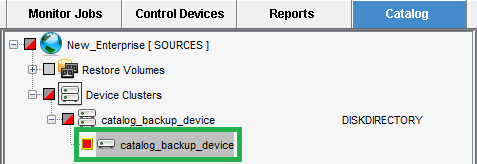In the SOURCES tree, drill down into the Device Clusters item to find the device node where the Catalog Backup is stored, and select it.\