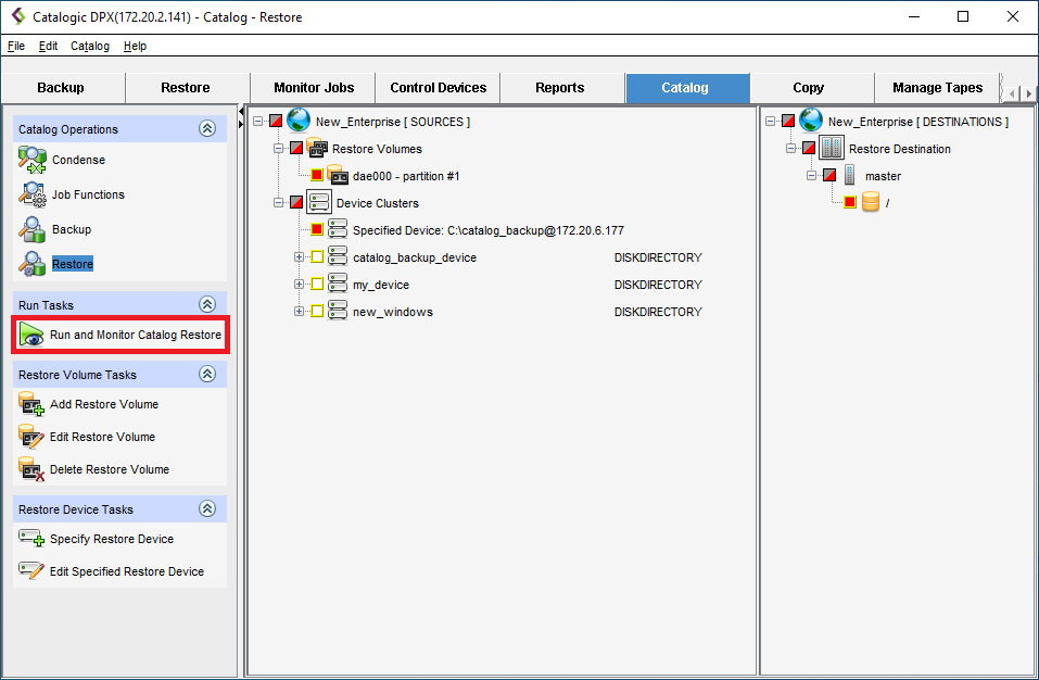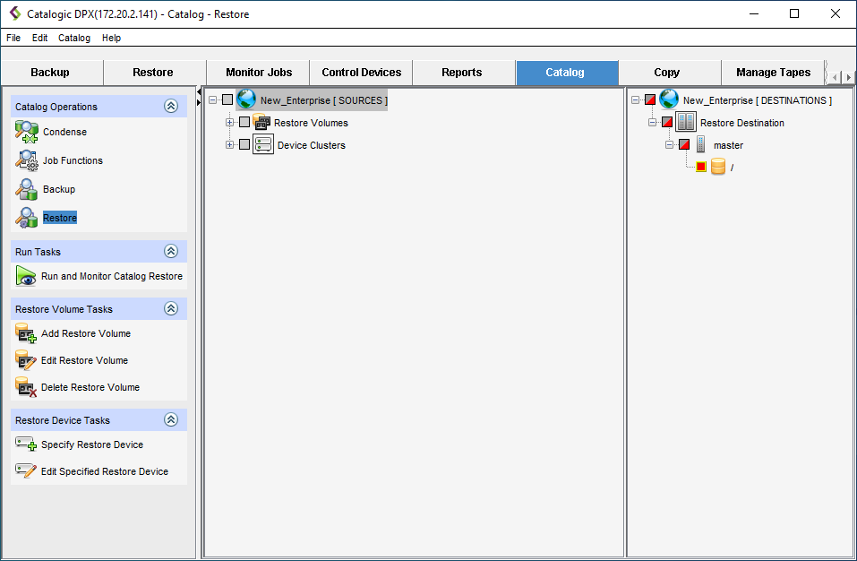 Make sure the master root directory is selected in the Destinations pane. This setting is default and cannot be changed, as the Catalog Restore job restores the Catalog to the Master Server on which the job is run.\