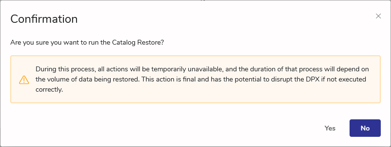To start the Catalog Restore job, click Yes. Once started, this process cannot be stopped or reverted. The following screens will be shown, indicating the progress of Catalog Restore.