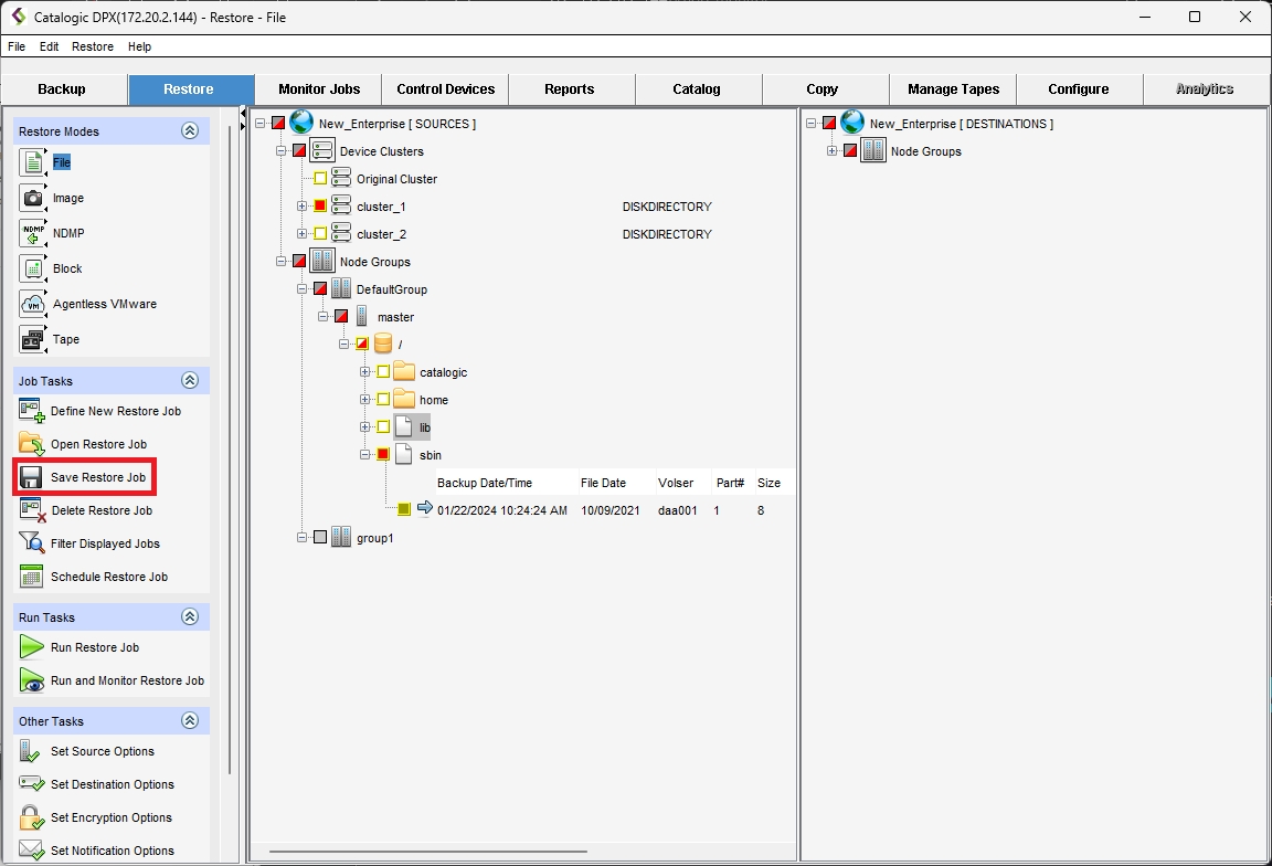 Select the source (a previously created file backup) and the destination for your restore job. Then, click Save Restore Job.