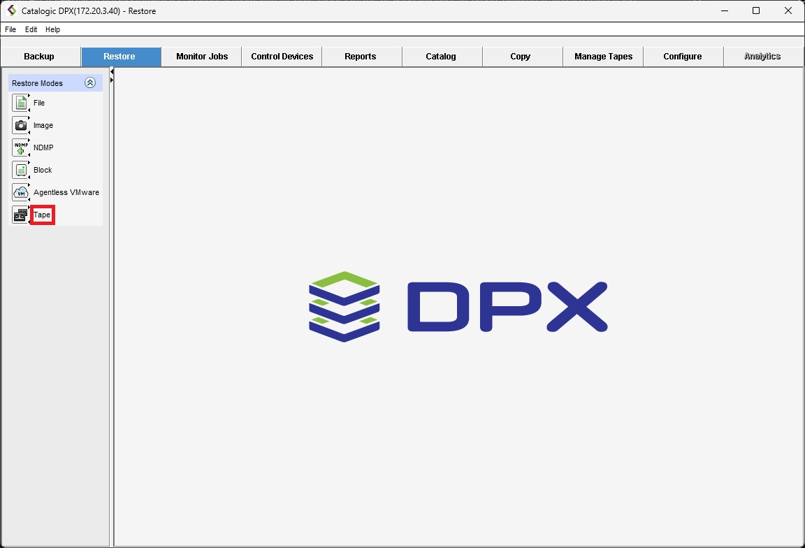 In the main desktop interface window, go to the Restore tab, and from the Restore Modes section in the task panel, choose Tape.