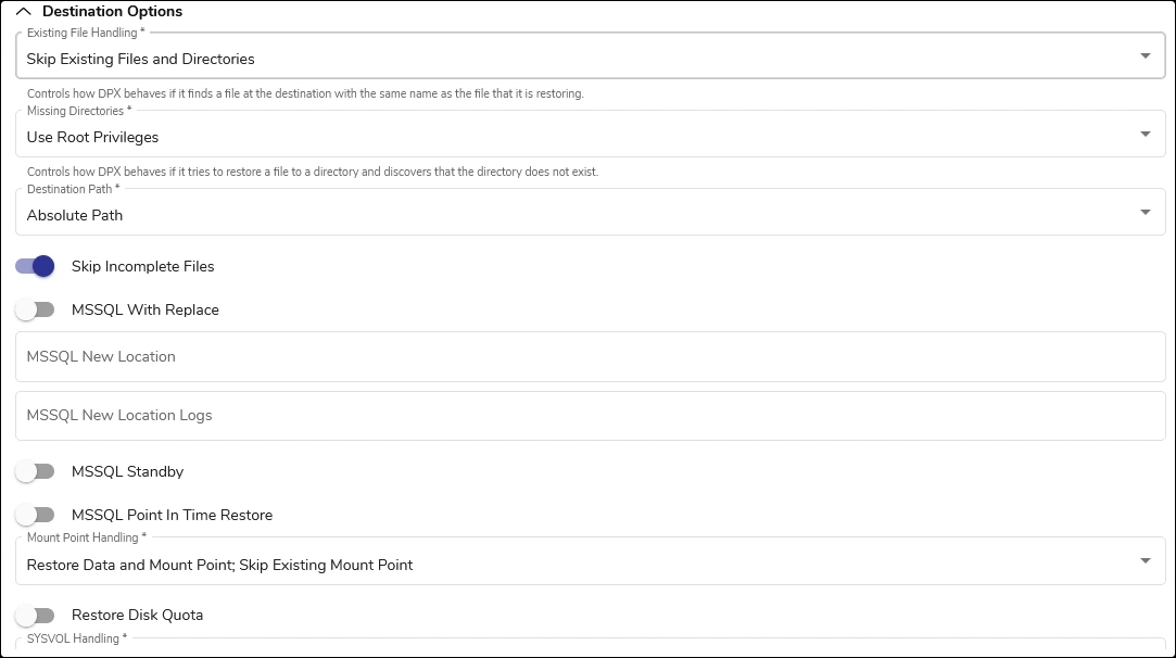 Note. Be aware that for Reconstructive Restores, DPX will default to the Restore Data and Mount Point; Replace Existing Mount Point option, regardless of the initially selected setting.