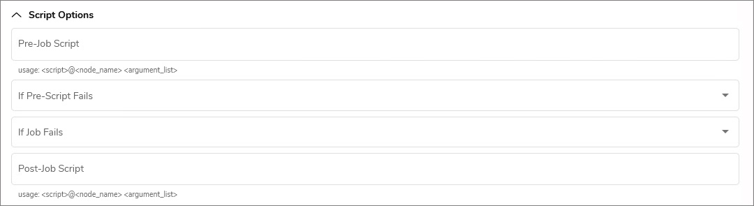 Specifies a script to run before the job starts, with options to handle scenarios where the script fails: