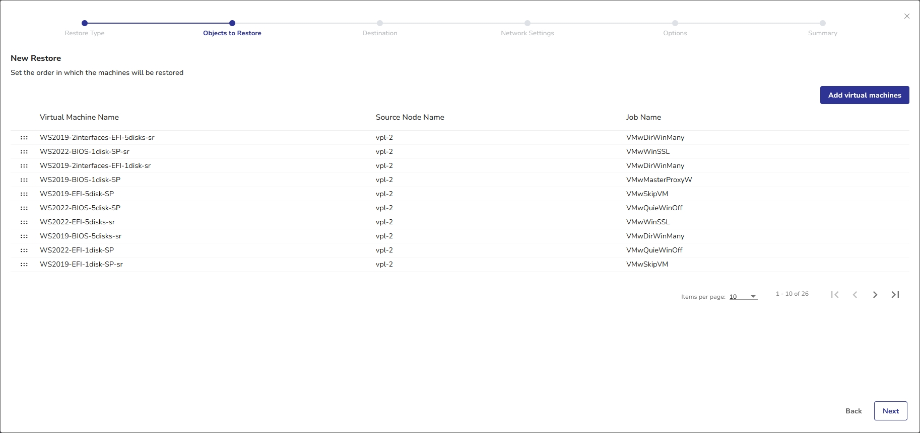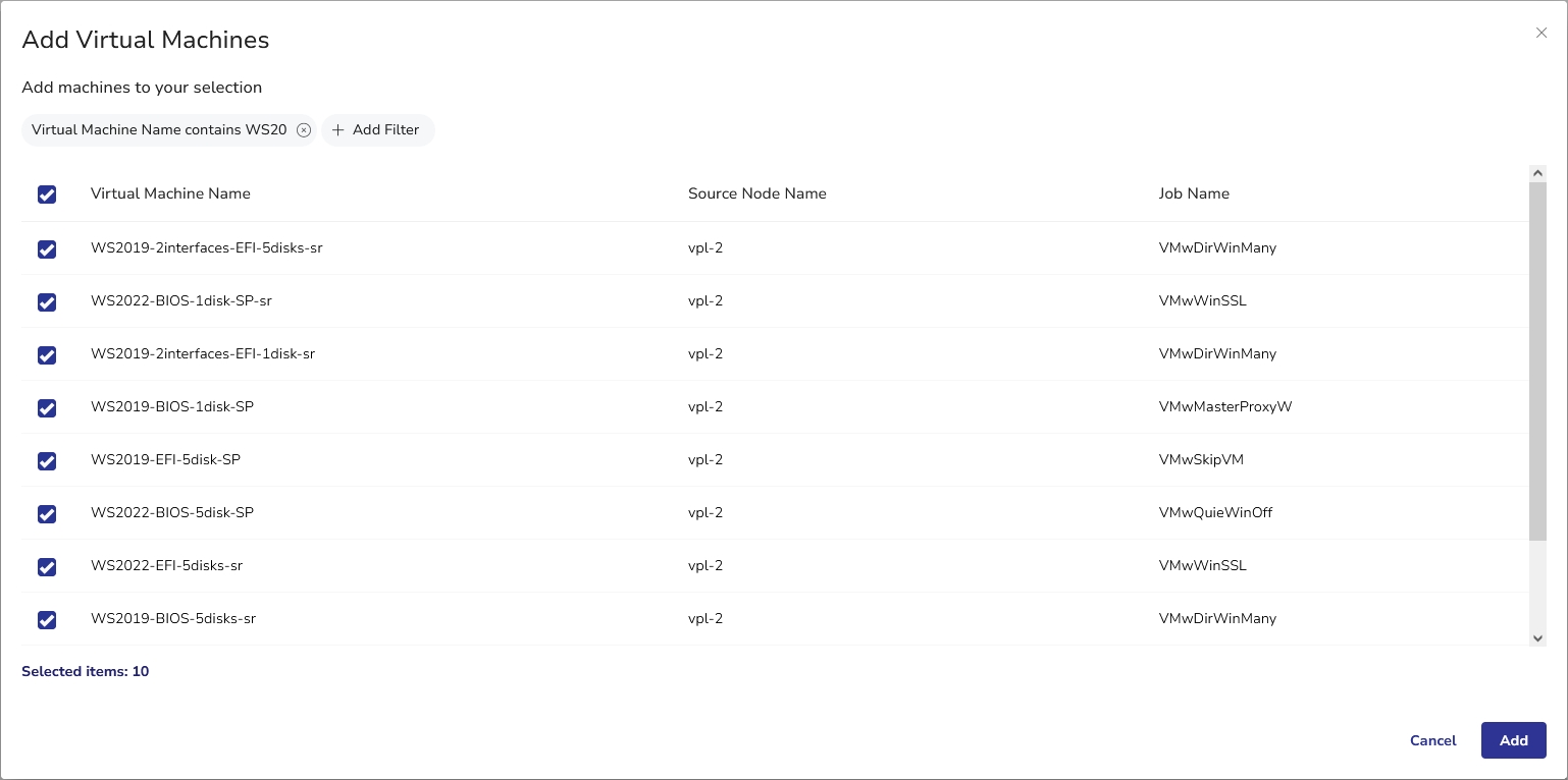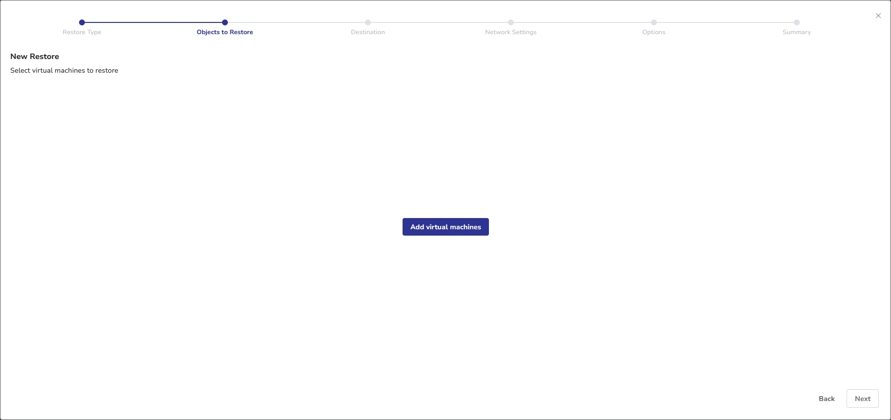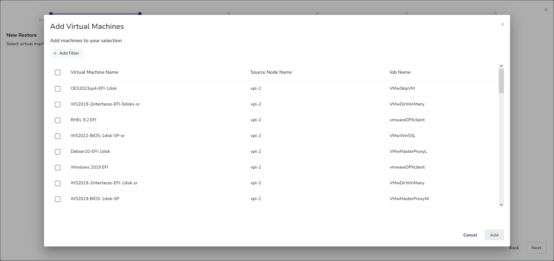Select the virtual machines you want to restore and click Add. The Add Virtual Machines dialog will close and the Objects to Restore view will be populated with the selected VMs.