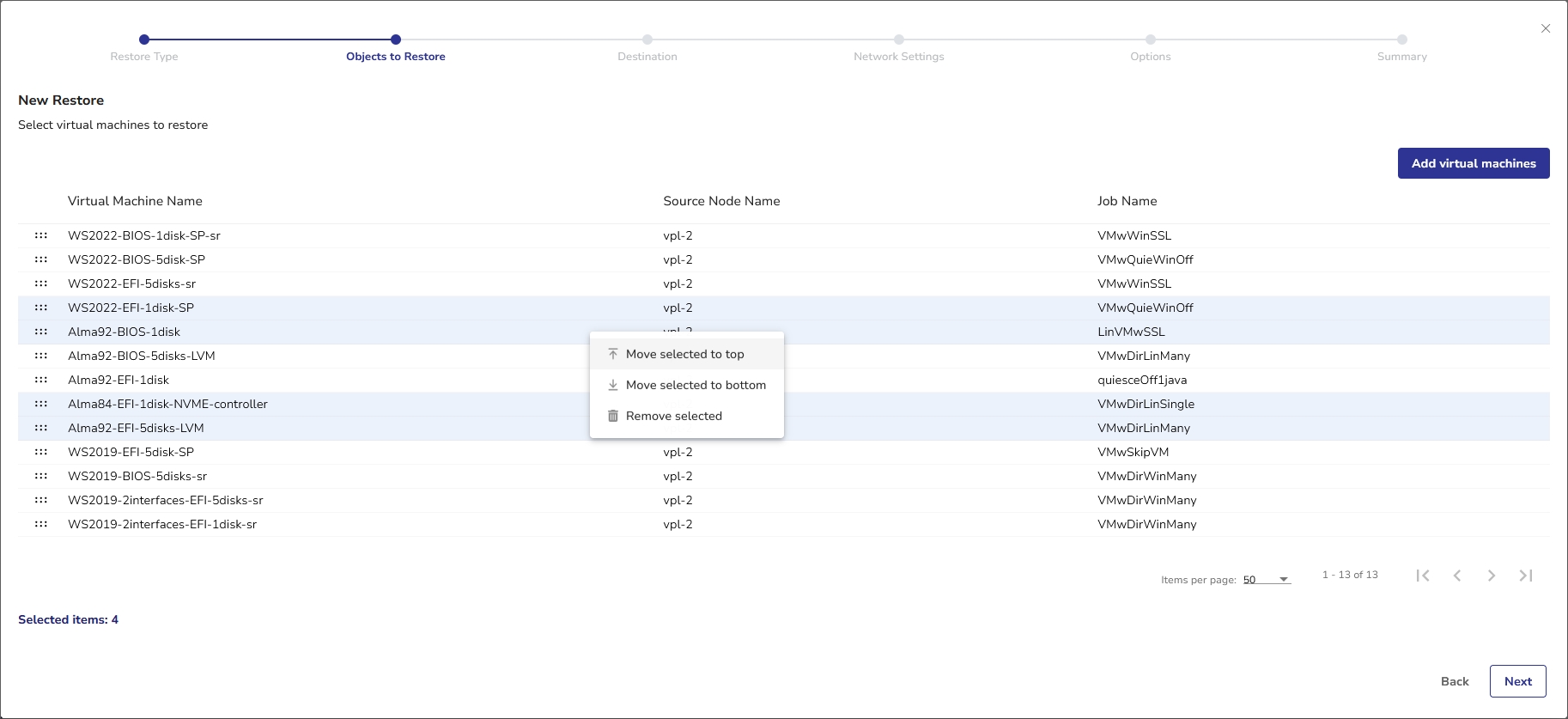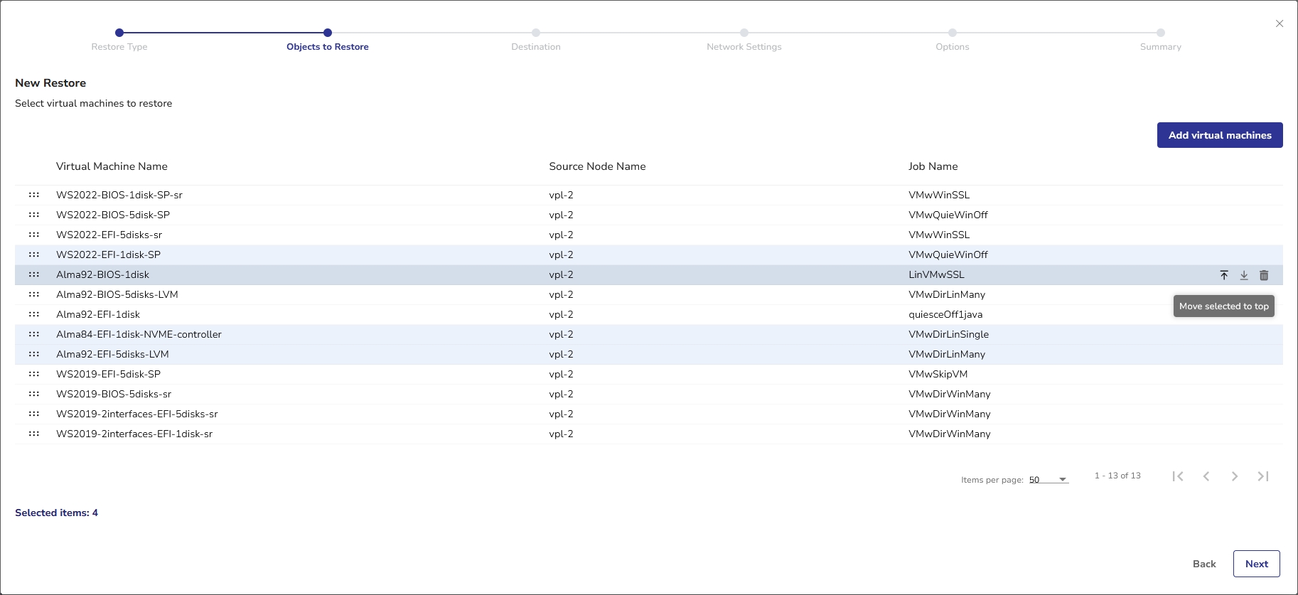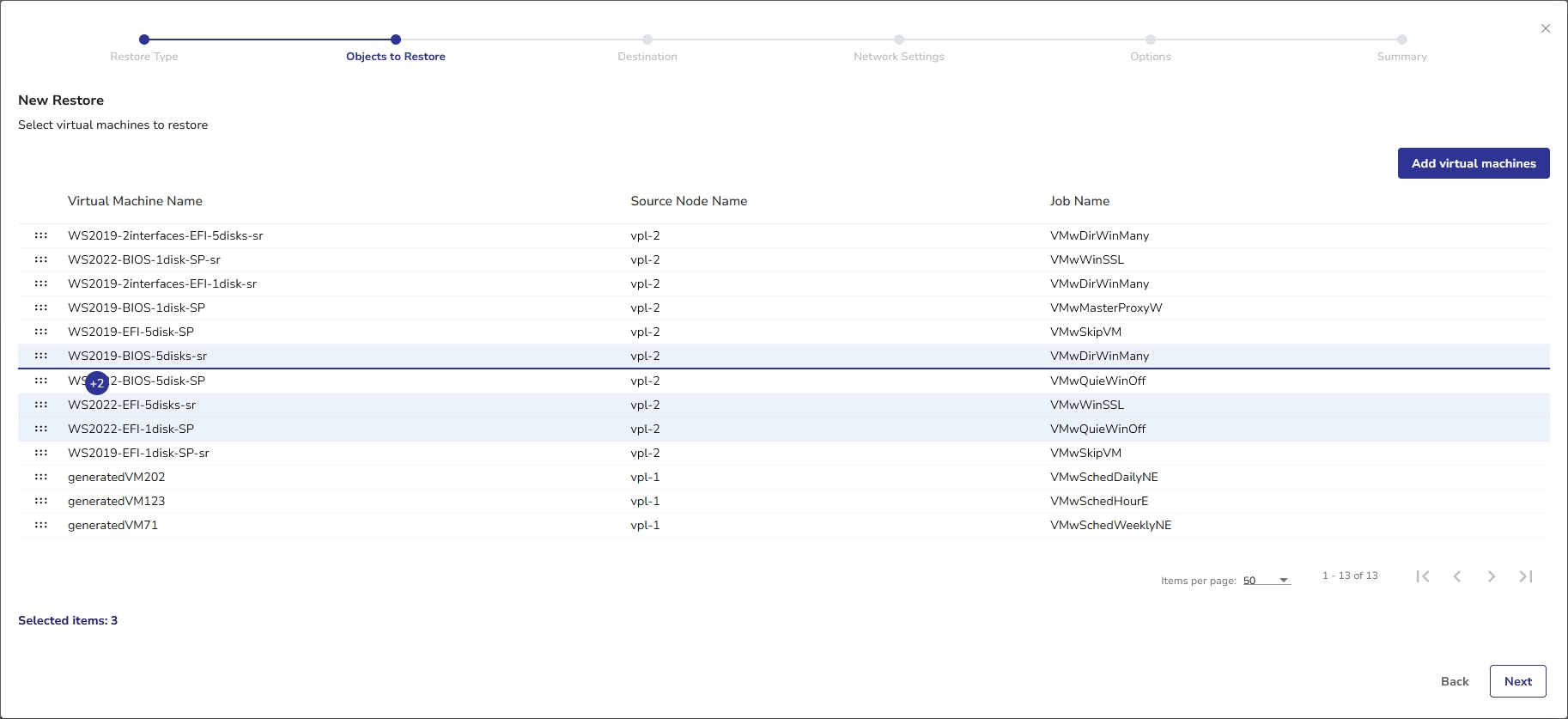 The Selected items value at the bottom of the list indicates the total number of VMs selected within the current restore job definition. If you want to add more VMs to the Objects to Restore view, click the Add virtual machines button in the upper right corner.