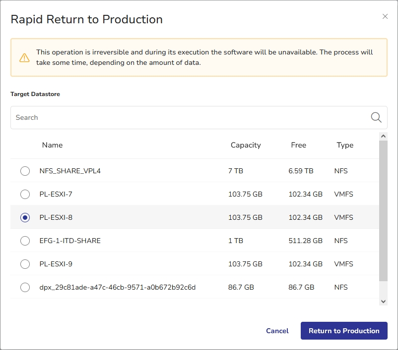 The Rapid Return to Production dialog will display. Select target datastore. You can use the search bar to find the desired item. The search is case-insensitive.