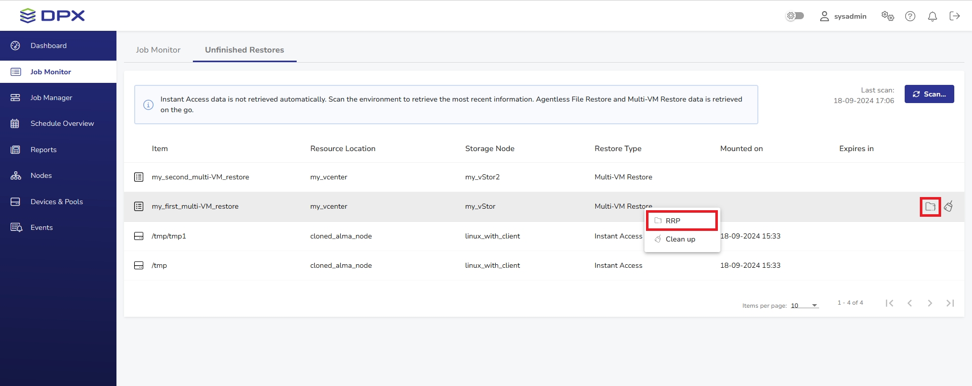 This feature allows the user to transfer all VM data to their actual location, rather than to use snapshots mounted from a backup storage, without any downtime. To fully restore your machines after a Multi-VM Restore job, go to the Unfinished Restores tab in Job Monitor.