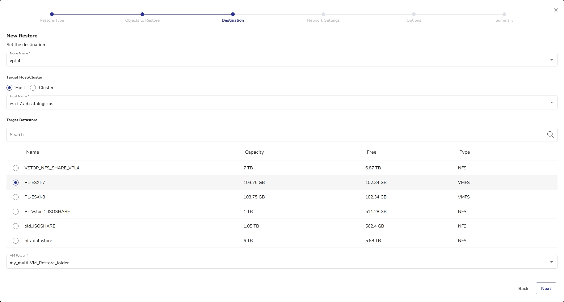Select the target datastore from the list. You can narrow down the displayed list by searching by the datastore name, or sort the list by Name, total Capacity, Free capacity or Type.