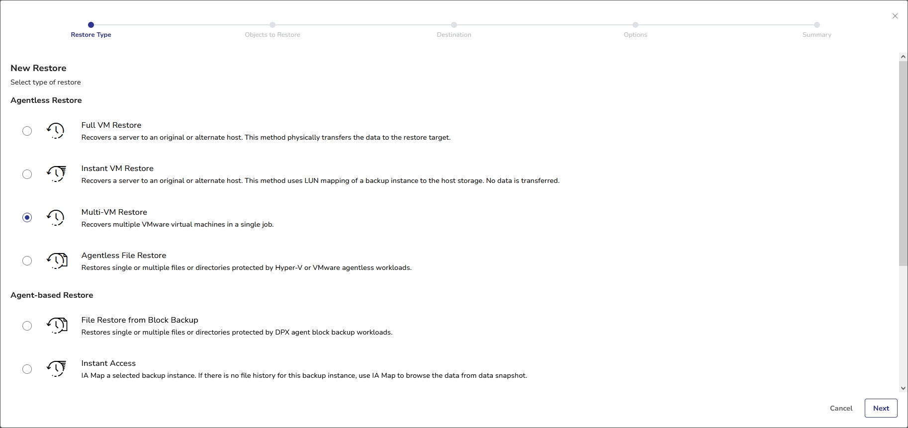 Restrictions. Multi-VM restore only supports recovery points stored on vStor. NetApp storages are not supported.