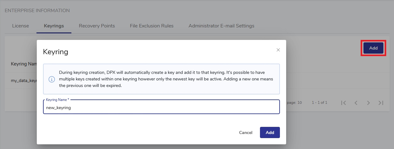 and whitespaces. The maximum length is 48 characters.Click Add. The new keyring is now created.