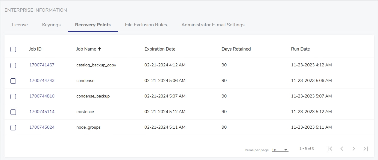 You can control the recovery points view by ordering items by Job ID, Job Name, Expiration Date, Days Retained and Run Date, ascending or descending. Note also the Items per page value which can be useful when managing the display.