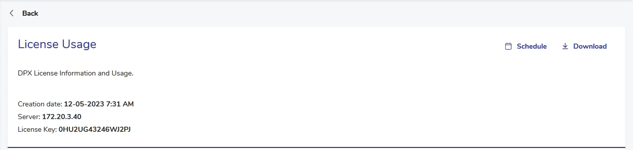 The License Report button at the very bottom of this section is used do display a detailed report on the DPX Master Server license and usage. The report can be viewed, downloaded or scheduled for being generated as a .pdf