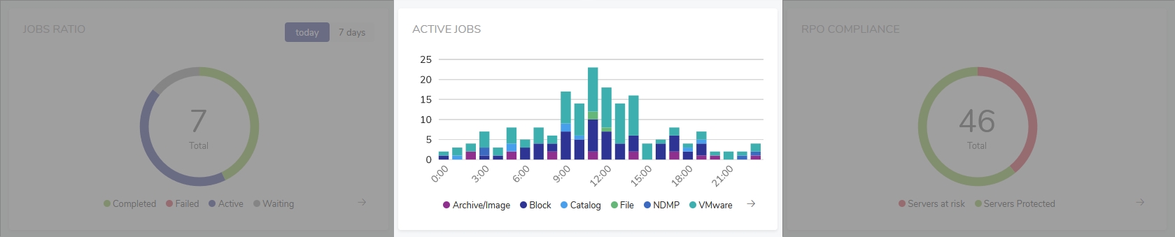 This widget shows the proportion of protected and unprotected nodes based on the RPO Compliance Report from the last 7 days. The arrow in the lower right corner will take you to the RPO Compliance Report in the Reports section.