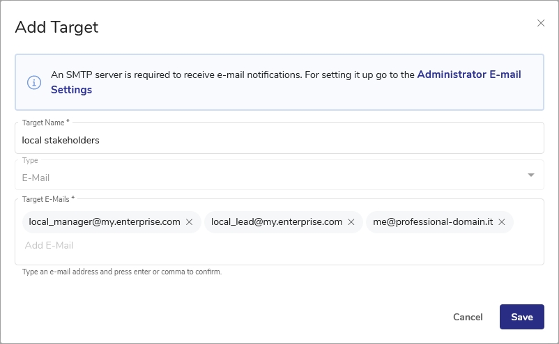 Specify Target E-mail. Multiple addresses are handled – just separate them with a comma or press Enter to confirm each e-mail address.