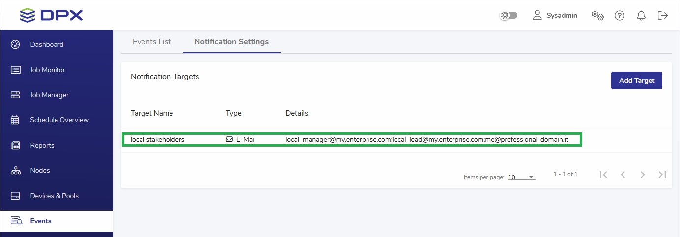 To add a notification target, click the Add Target button. The Add Target dialog will appear.