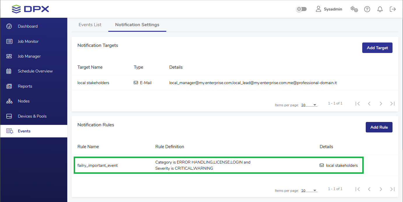 The Notification Settings tab consists of two main areas: Notification Targets, where notification recipients are defined and stored, and Notification Rules, which stores definitions of situations when a certain notification target is sent a message.