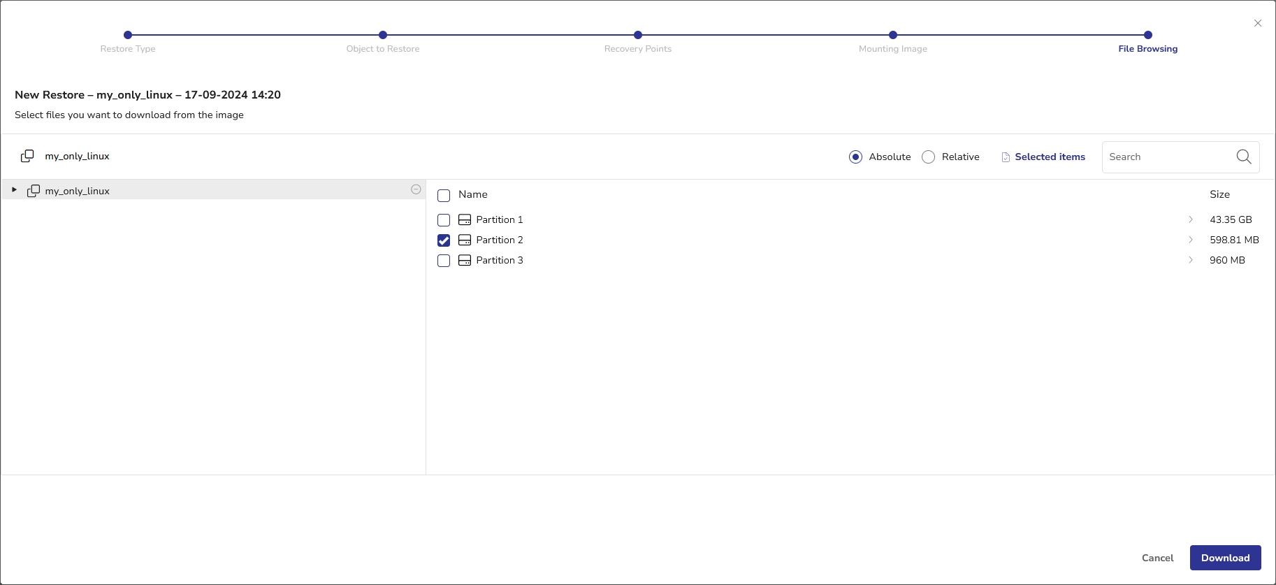 or the Browse option in the context menu under the right-click will take you to the final step of the Agentless File Restore workflow where you can select individual files or entire folders to restore. They will be downloaded as .zip archives to the machine you are using to connect to the web interface.