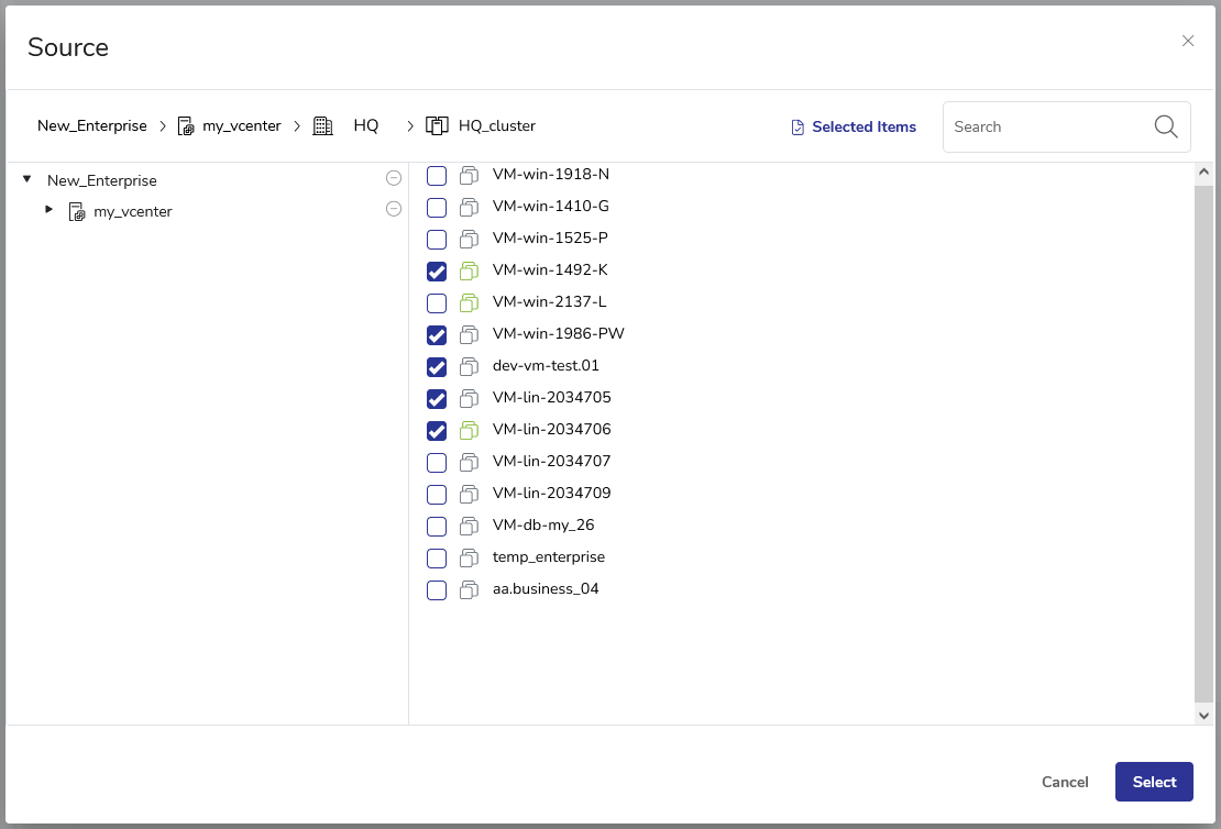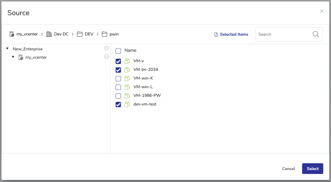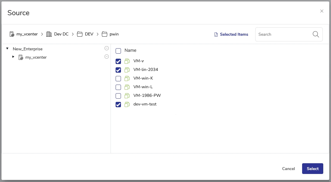 Click Add Source in the SOURCES pane to specify which volumes you want to back up. The Source selection dialog will appear. Select the desired VMs and click Select.