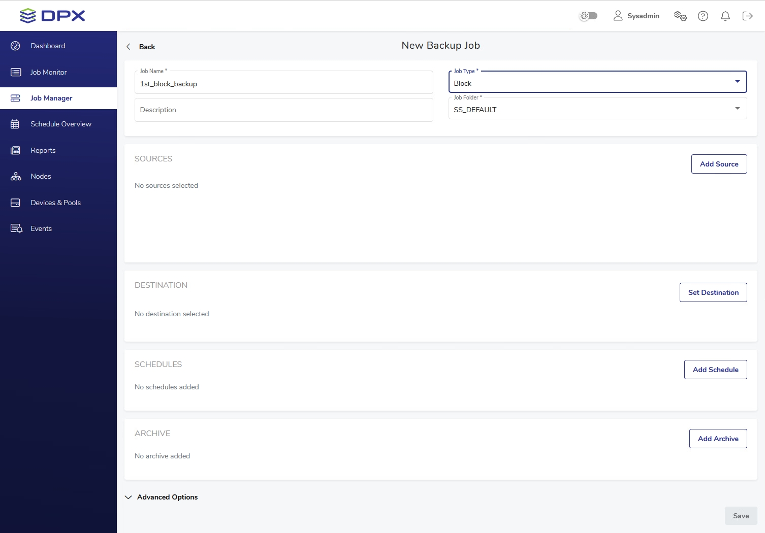 In the web interface, block backups are defined in the Job Manager section. In the desktop interface, block backups are implemented through a backup wizard.